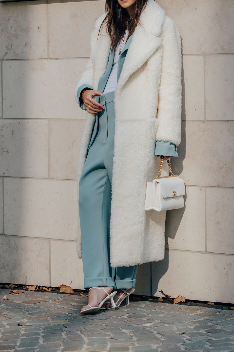 Den wohl schönsten Shearling Mantel in weiß gibt es von Common Leisure, einer mittlerweile bei Fashionistas beliebten Marke, die komplett auf Pelz verzichtet. Besonders ist auch der androgyne Schnitt des Maximantels, der mir als erstes ins Auge gefallen ist. Im Grunde ist er auch vielseitig kombinierbar. Farben wie pastellrosa und beige verleihen eine warme, freundliche Note, während hellblau oder wie hier ein Anzug in mintgrün kühl und mondän zugleich wirken.